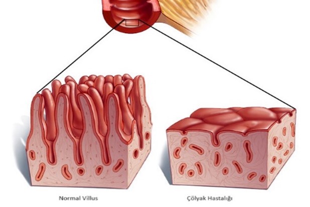 Bağışıklık sistemimiz bakteri, virüs gibi zararlı maddelere karşı antikor üreterek vücudumuzu korumakla görevlidir. Ancak bazen zararsız olabilecek maddelere karşı da antikor oluşturabilir. Çölyak hastalığında vücuda gluten alındıktan sonra bağışıklık sistemimiz antikor üretmeye başlar. Üretilen bu antikor ince bağırsaklarda besinlerin emiliminden sorumlu olan villus adı verilen parmaksı çıkıntılara zarar verir. Zamanla villusların boyları kısalır ve yapısı düz bir hale gelir. Bu durumda kişi tükettiği besin ögelerinin emilimi sağlayamaz. Özellikle demir, folat gibi minerallerin emiliminde azalmalar meydana gelir.